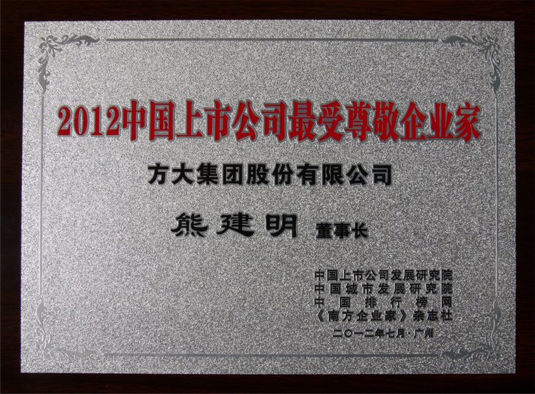 2012年7月30日,“2012中国上市公司最具投资价值100强”排行榜在广州揭晓,方大集团荣登“中国上市公司最具投资价值100强”榜单,熊建明董事长荣膺“2012中国上市公司最受尊敬企业家”。