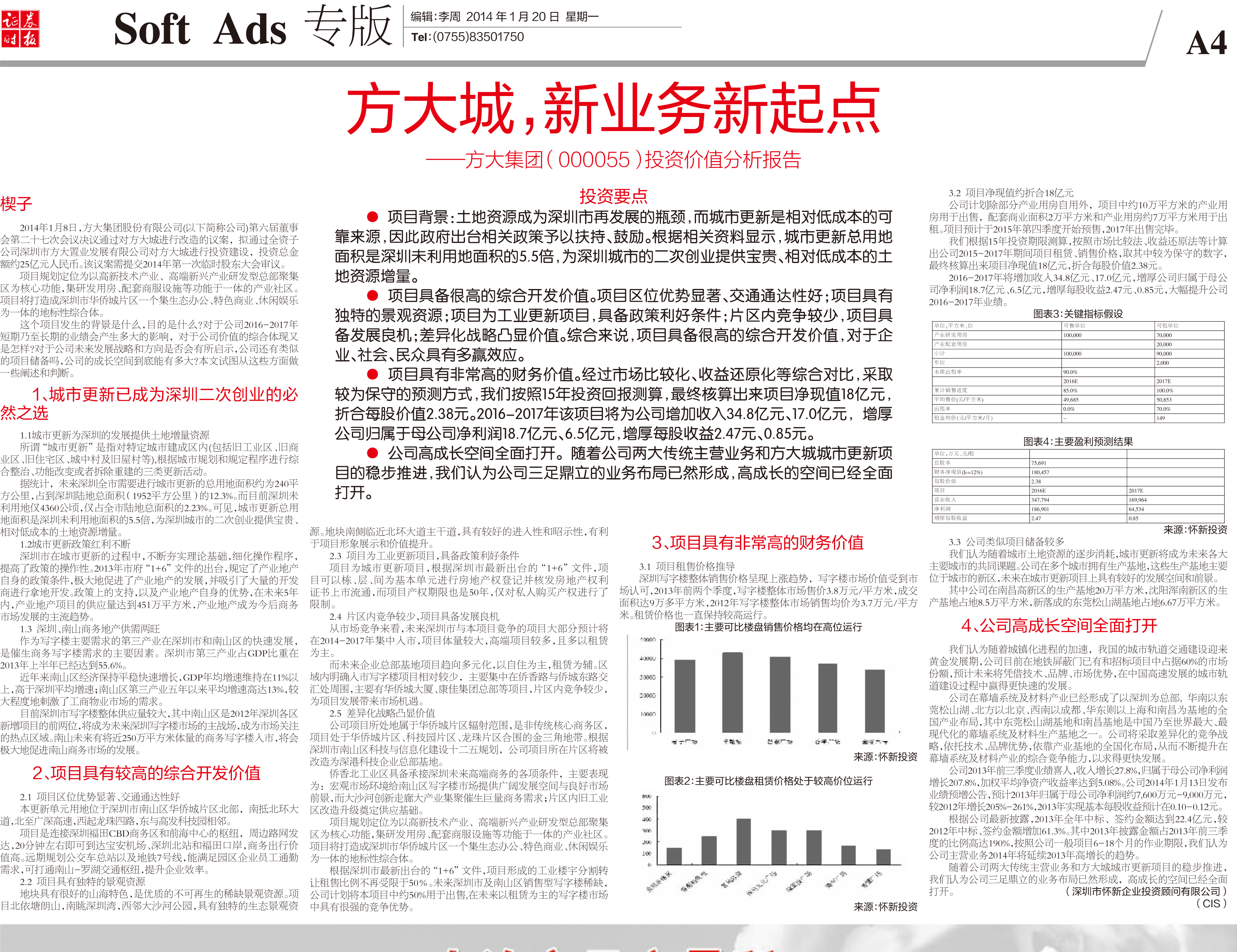 2014年1月20日《证券时报》专版大幅刊登《方大城,新业务新起点——方大集团投资价值分析报告》