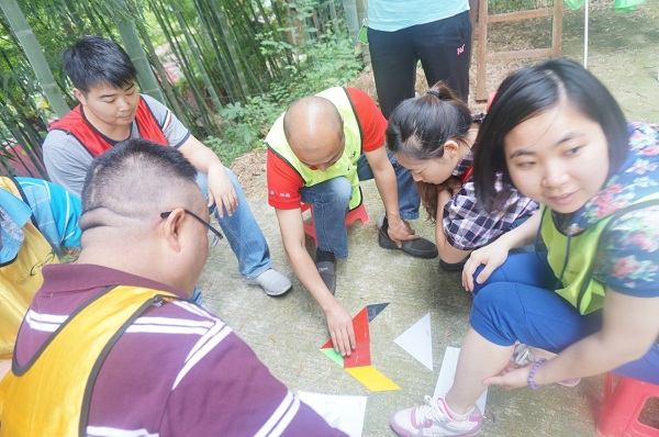 集合、报数、整队、分组,一行人被分为6组开始不同主题的拓展活动,学员们分别进行了“国王与天使”、“目标市场”、“七巧板”、“团队动力圈”、“挑战99”、“合力致胜”和“毕业墙”等拓展科目。