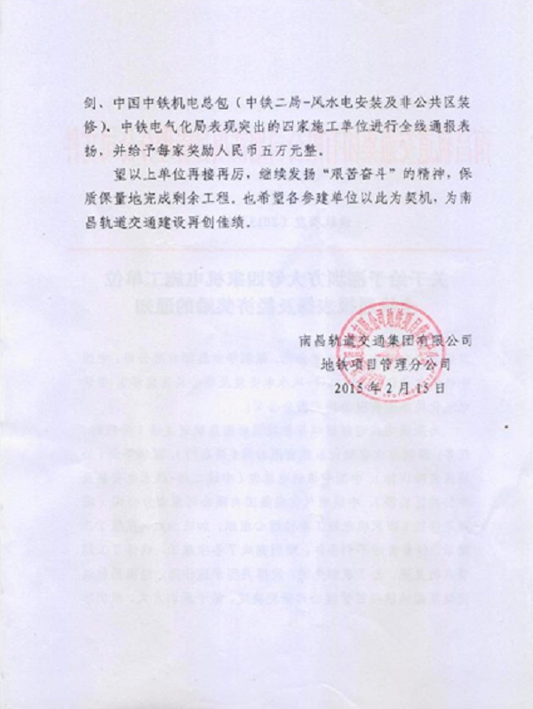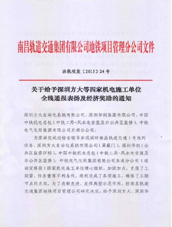 新年伊始,方大自动化公司再次喜获嘉奖。南昌轨道交通集团为表扬先进,决定给予深圳市方大自动化系统有限公司等四家施工单位通报表扬。并给予五万元奖励。